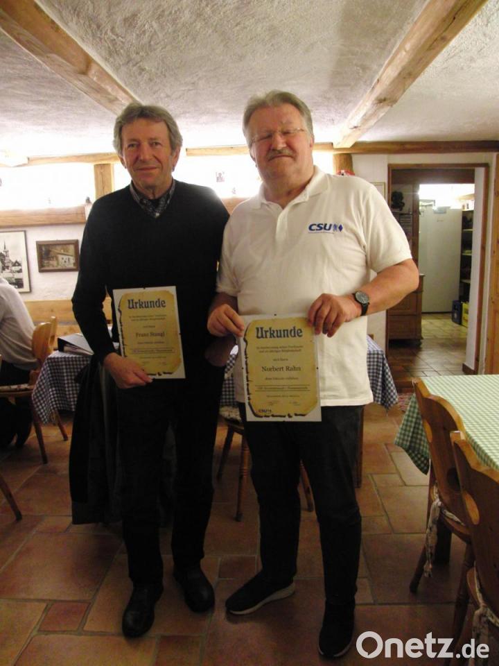 Zwei Ehrungen standen ebenfalls an, die stellvertretendes Kreisvorstandsmitglied Johannes Reger und Vorsitzender Naber übernahmen. Ganze 35 Jahre lang ist Franz Stangl nun schon der CSU treu. 20 Jahre unterstützt Norbert Rahn die Partei. Beide erhielten Urkunden für ihre langjährige Mitgliedschaft.