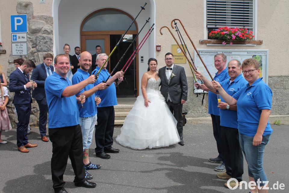 Vor dem Standesamt warteten schon die Arbeitskolleginen der Braut mit einem Spalier aus Paragraphenschlüsseln, sowie eine Abordnung der Wanderfreunde aus Pressath mit Wanderstöcken als Spalier, durch das das Brautpaar gehen musste. Auch der obligatorische Reisregen durfte nicht fehlen. Der Bräutigam Anton Haberl, er hat den Namen der Braut angenommen, ist bei den Wanderfreunden schon seit Februar 2011 der zweite Vorsitzende. Sein Vater schon zich Jahre erster Vorsitzender. Die Hochzeitsfeier fand in der "Schloßschänke" in Friedenfels statt. das Paar wohnt in Krummennaab.