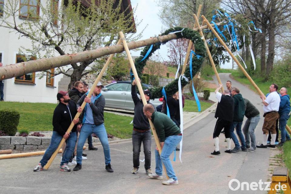 Da waren die Muskelkräfte vieler Männer gefragt: Mit körperlichem Einsatz hievten sie am Samstagabend den Kuchenreuther Maibaum nach oben. In dem Dorf ist man der Tradition verpflichtet: Begleitet von den passenden „Hau-Ruck“-Signalen, wussten die Männer genau, wann die jeweils zwei Stangen, die zu so genannten Schwalben verbundenen waren, gegen den Baum gedrückt werden mussten. Nach einigen Minuten war nagelneue, etwa 22 Meter hohe Maibaum an der richtigen Stelle fest verankert. Die Besucher, die scharenweise gekommen waren, stärkten sich mit Speisen vom Grill und ließen sich so manche Halbe gut schmecken.