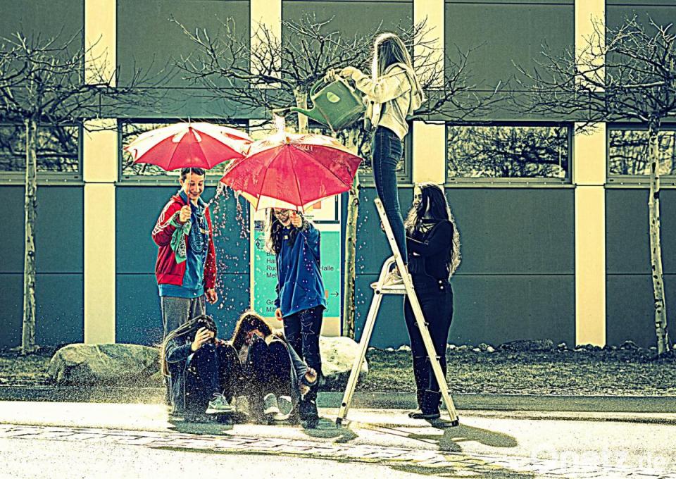 Waren diese Themen erst einmal identifiziert, entwickelten die Schüler in Gruppen ein Konzept für ihr Foto. Daraufhin ging es an die Umsetzung mit vielen Requisiten, an verschiedenen Orten und begleitet von fachkundigen Tipps des Fotografen von Glaser-Gallery. Es wurde über die Rollen der Szene diskutiert, unterschiedliche Posen und Einstellungen der Kamera ausprobiert, bis das Bild zur Zufriedenheit der Jugendlichen ausfiel. Um die Botschaft, die sie den Betrachtern ihrer Bilder vermitteln wollen, noch besser hervorzuheben, verfassten sie zusätzlich zum Titel noch passende Bildbeschreibungen. Um die Fotos zu perfektionieren, gab es beim nächsten Treffen eine Einweisung in die Grundlagen der Fotobearbeitungsprogramme und gleich die Chance, das neugewonnene Wissen anzuwenden.