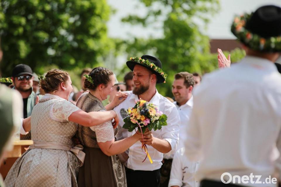Mit einem Traktor kamen die Kirwapaare, begleitet von der Musikgruppe D'Allerscheynsten, zum Festplatz gefahren, wo sich bei Sonnenschein viele neugierige Zuschauer versammelt hatten. Tanzlehrer Michael Streber hatte mit den feschen Paaren viele Tänze vorbereitet. Den Abschluss bildete ein Walzer, bei dem ein Blumenstrauß seine Runden drehte. Als die Musik verstummte, war klar: Das neue Oberkirwapaar bilden Sabrina Schwendner und Gerlando Birzer.