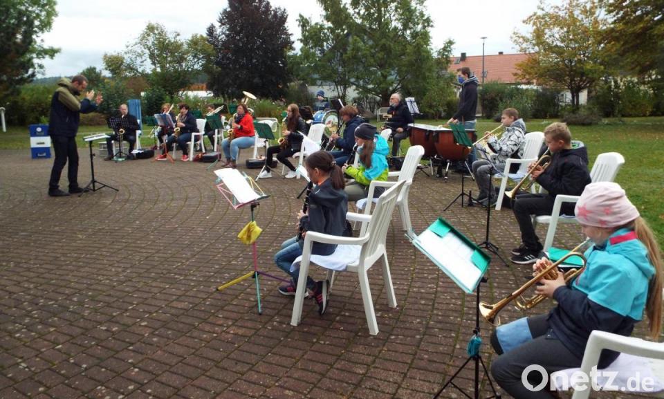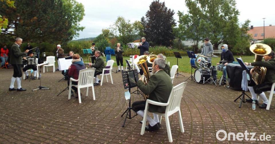 Abstand war auch jetzt noch ein Thema, zwei Meter sind vorgeschrieben, aber die konnten die Musiker sowohl im Garten des AWO-Seniorenzentrums als auch beim anschließenden Standkonzert vor dem Rathaus problemlos einhalten. Ein zweifacher Auftritt sozusagen, den Vorsitzender Karl-Heinz Müller da anberaumt hattet. Den Anfang machte im AWO-Garten das Nachwuchsorchester des Musikvereins. Der Name bezieht sich aber keineswegs auf das Alter, auf jugendlichen Nachwuchs wie man meinen könnte. Sondern in diesem Klangkörper haben sich unter der Leitung von Uli Wiesneth Musiker jeglichen Alters zum gemeinsamen spielen zusammengetan, um dann einmal im großen Orchester mitmachen zu können. Bei dem Auftritt ließen sie ganz beachtliche Fortschritte erkennen.