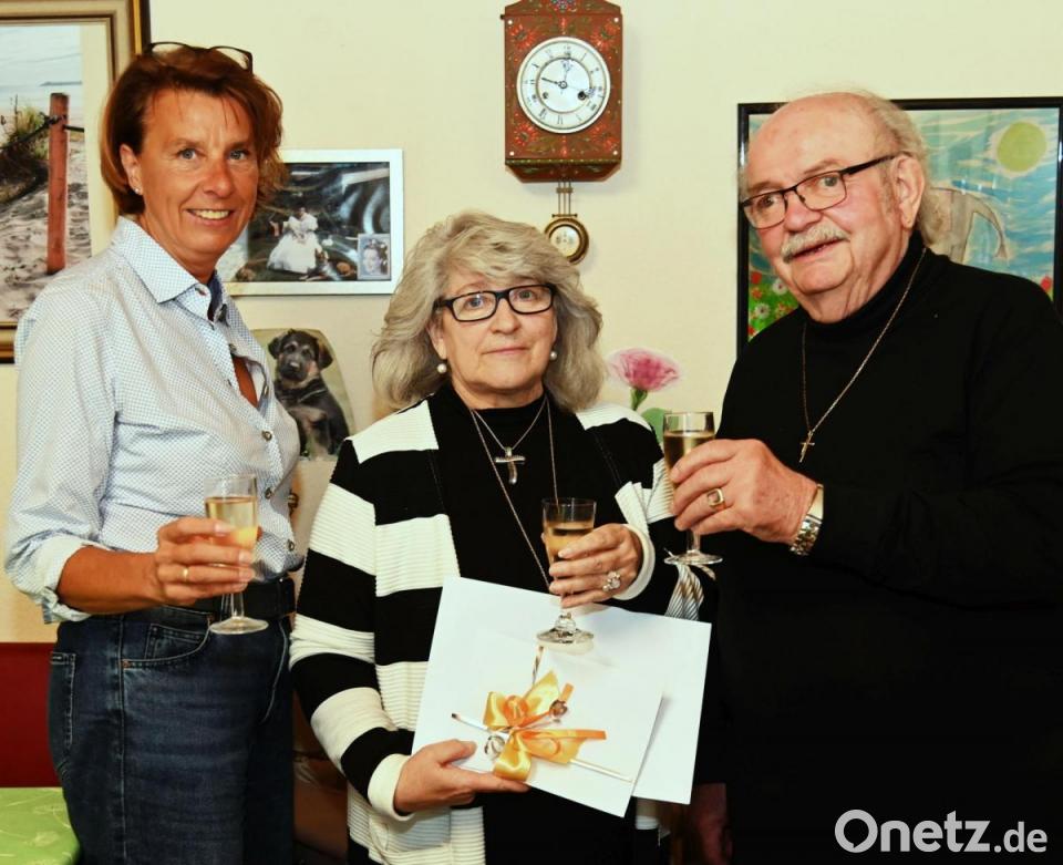 Brav folgte der Schäferhund aber dem Zuruf „ab ins Körbchen“ seines Frauchens, als anlässlich der Goldenen Hochzeit Freunde und Bekannte zum Gratulieren kamen. Darunter war auch die Zweite Kümmersbrucker Bürgermeisterin Birgit Singer-Grimm, die im Namen der Gemeinde gratulierte und neben einer Urkunde auch einen Geschenkgutschein überreichte.