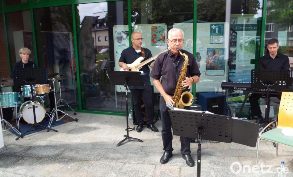 Die Veranstaltung ist ein Juwel im Kümmersbrucker Kulturkalender – allerdings hat es sie wegen der Pandemie exakt 726 Tage nicht mehr gegeben. Jetzt aber ging der Jazz-Frühschoppen endlich wieder live über die Bühne, besser gesagt über den Rathaus-Vorplatz. Ein schon vertrautes, vielseitiges Programm, von Swing bis Bebop, mit der Band Blue Note Project – und doch hat sich einiges geändert. Alle sind zwei Jahr älter geworden, die Wohn- und Geschäftshäuser des Seniorenwohnparks nebenan standen vor zwei Jahren noch nicht, und der Eintritt war diesmal aus Pandemie-Gründen reglementiert. Und die Band mit Lothar Kiehl (Saxofon), Marc Hohl (Gitarre) und Antje Storch (Drums) bekam mit Klaus Schmidt einen neuen Musiker am Piano.