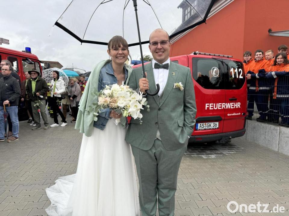 Nur das Wetter wollte nicht so recht mitspielen – aber mit Wasser kennen sich Anja (25) und Florian Schlegel (31) als aktive Feuerwehrleute ja aus. Also nahmen sie den Nieselregen, der ihre kirchliche Trauung am vergangenen Samstag, 14. September, in Theuern begleitete, einfach mit Humor. Und mit Schirm. Der Sektempfang wurde kurzerhand in die Fahrzeughalle der FFW Theuern verlegt.