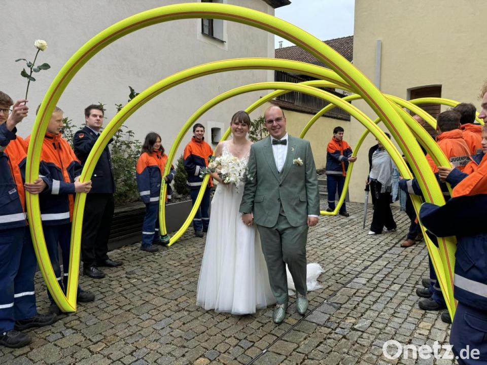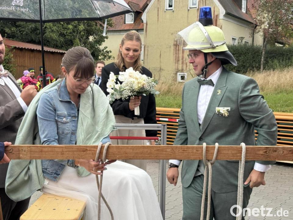 Kein Wunder, dass die Trauung der beiden am Samstag von viel Blaulicht begleitet wurde: Kameraden aus verschiedenen Feuerwehren und aus der Kreisbrandinspektion standen Spalier mit weißen Rosen und gelben, zu Torbögen aufgeblasenen Feuerwehrschläuchen, und natürlich begleiteten Blaulicht und Martinshorn das Paar zum Feuerwehrhaus in Theuern. Bevor die beiden dort mit Familie, Freunden und Wegbegleitern auf ihre Hochzeit anstoßen konnten, mussten sie sich erst einmal in einem Feuerwehr-Gaudi-Parcours beweisen: Der Bräutigam als "Fahrer" mit Blaulichthelm, die Braut als "Chefin" und "Sirene". Im Slalomkurs mit Handwagen, Knotenknüpfen und Löscheinsatz bewiesen die beiden, dass sie nicht nur bei der Feuerwehr ein perfektes Team sind.