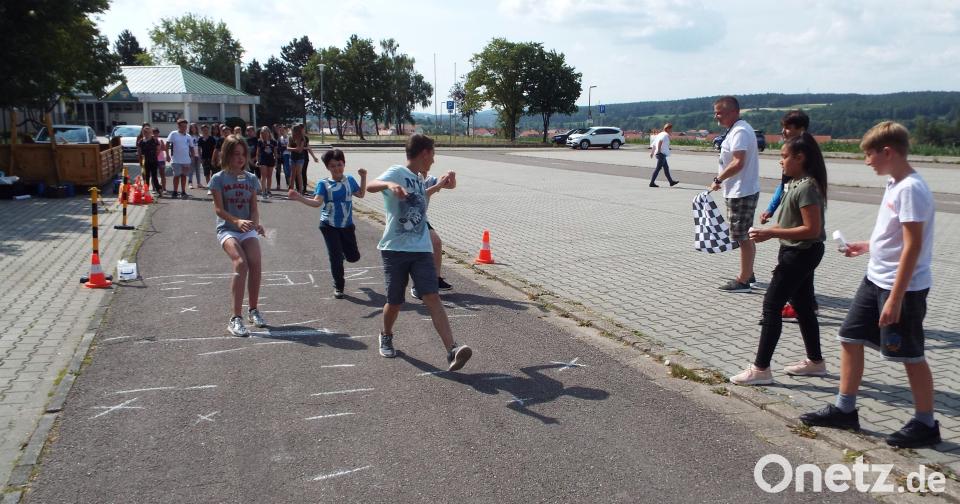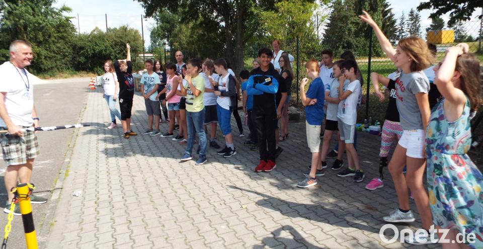 (e) Praktischer Anschauungsunterricht: Die fünften und sechsten Klassen der Kümmersbrucker Schule wurden auf dem Parkplatz vor dem TSV Sportgelände von den pädagogisch ausgebildeten Moderatoren Annette Halvorsen und Stefan Mägle vom ADAC geschult und für die Gefahren im Straßenverkehr sensibilisiert.