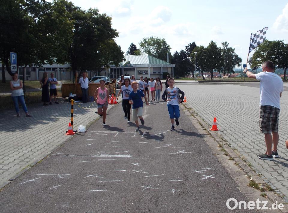 Den Anfang machten sie bei sich selbst: Aus vollem Lauf mussten die Kinder an einer Ziellinie stoppen. Schnell erkannten sie, dass sie dabei nicht sofort stehen bleiben können. Noch länger dauert es bis sie wieder stehen, wenn sie mit dem Abbremsen warten müssen bis Mägle eine Flagge hebt. Aus dieser praktischen Übung wurde gemeinsam mit den Moderatoren die Formel "Reaktionsweg plus Bremsweg ist Anhalteweg" erarbeitet. Diese Erfahrungen galt es nun für die Schüler auf das Auto zu übertragen: Sie mussten den Anhalteweg eines sich mit 50 Stundenkilometern nähernden Fahrzeuges abwägen und dort Pylonen aufstellen - und verschätzten sich gewaltig.