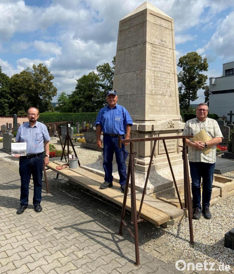 Vom hervorragenden Verlauf der Sanierungsarbeiten überzeugten sich der gemeindliche Bautechniker Michael Pollok und der Historiker Günther Rambach, der die Geschichte des Franzosendenkmals anlässlich einer Sonderausstellung in Schloss Theuern 2017 wissenschaftlich aufbereitet hatte. Nach der Restaurierung wird der empfindliche Sandstein imprägniert. Die Kosten für die gesamte Maßnahme belaufen sich auf etwa 6000 Euro.