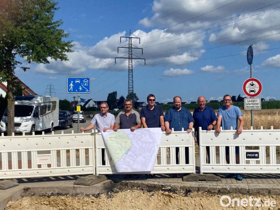 In Kümmersbruck werden zwei Regenrückhaltebecken gebaut. Von links: Werner Stauber (Planungsbüro Renner+Hartmann), Siegfried Däs, Thorsten Bauer (Fa. Rubenbauer), Udo Hartmann (Renner+Hartmann), Bürgermeister Roland Strehl und Ronny Gäßner vom Bauamt vor der Baustelle zum Hochwasserschutz in der Sebastian-Kneipp-Straße.