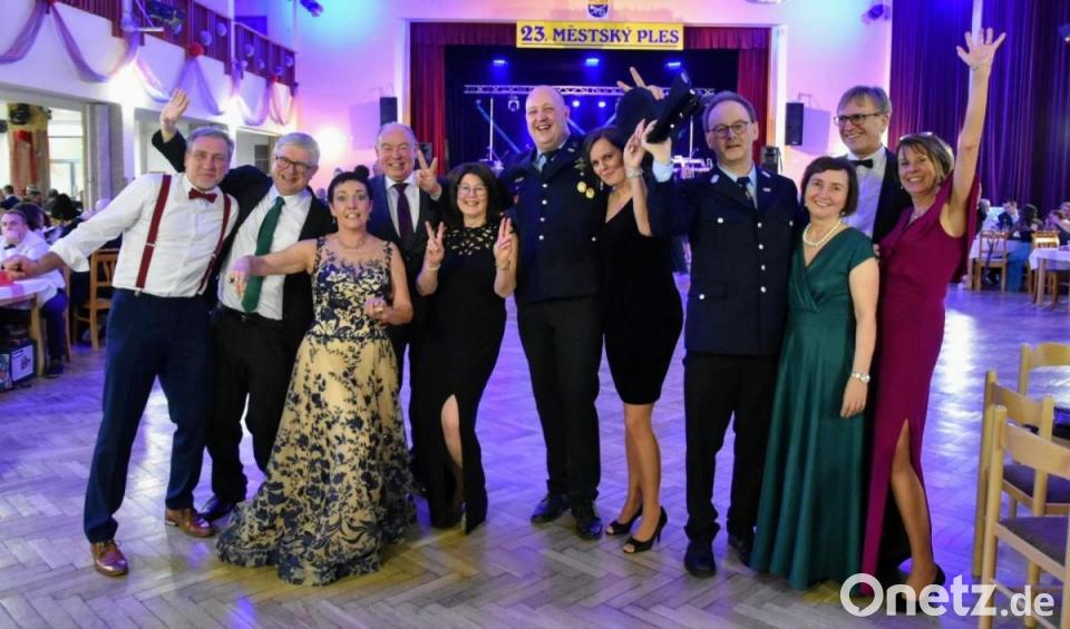 Die Kümmersbrucker haben einen Riesenspaß beim Stadtball in der Partnergemeinde Holýsov (von links): Markus Leitl, die stellvertretenden Bürgermeister aus Holysov, Libor Schröpfer und Hanka Valachovicova, Bürgermeister Roland und Gabi Strehl, Andre Lobenhofer, Eva Cervena, Wolfgang und Birgit Roggenhofer, Manfred Singer und Zweite Bürgermeisterin Birgit Singer-Grimm.