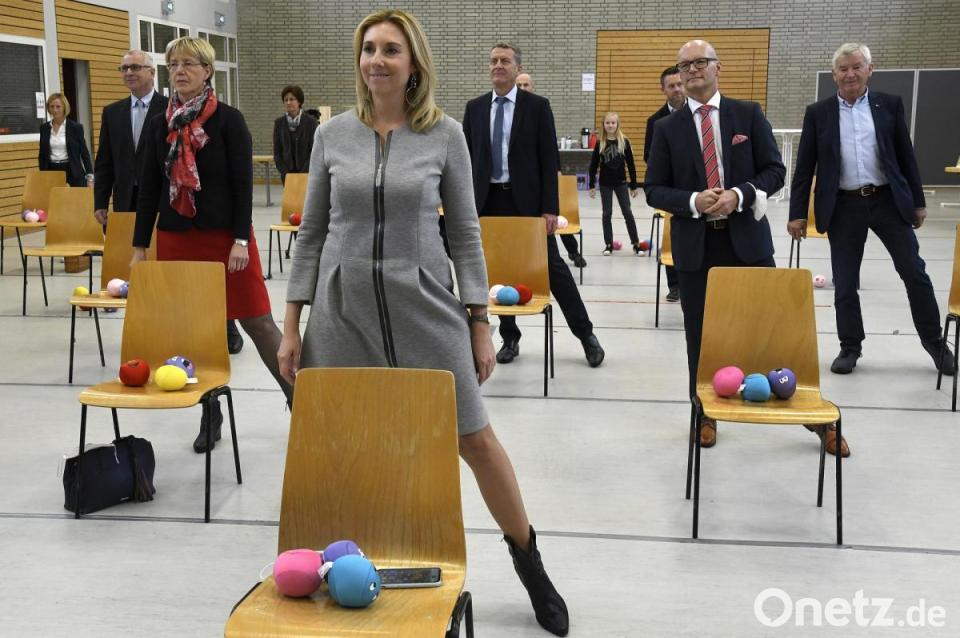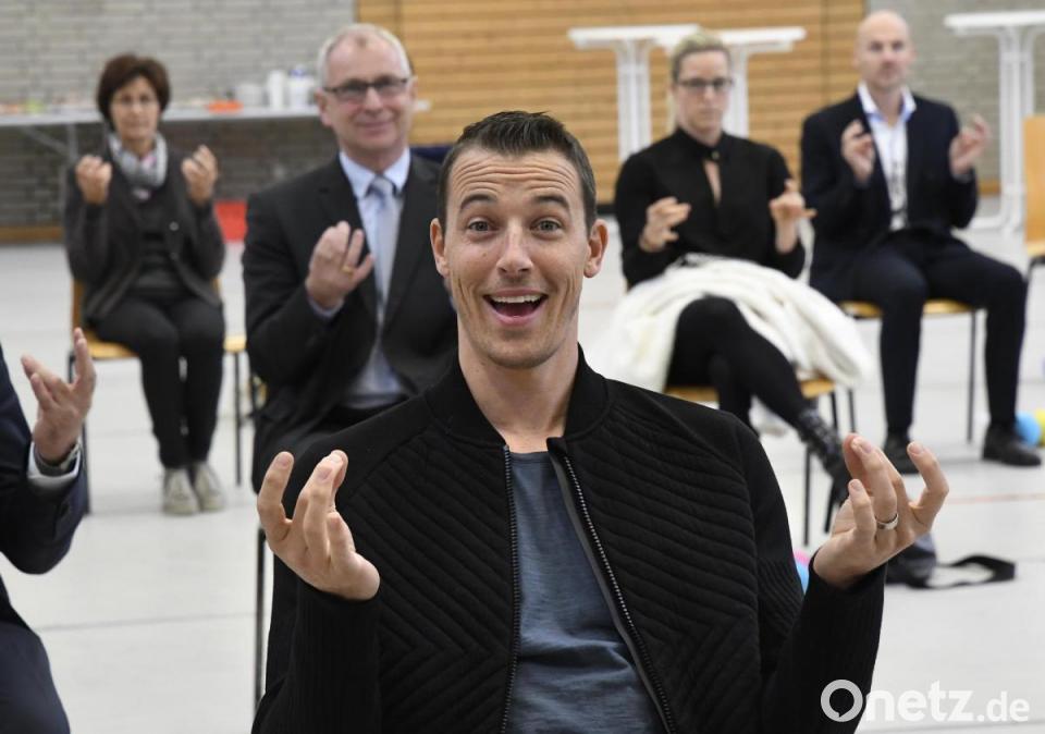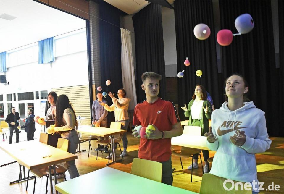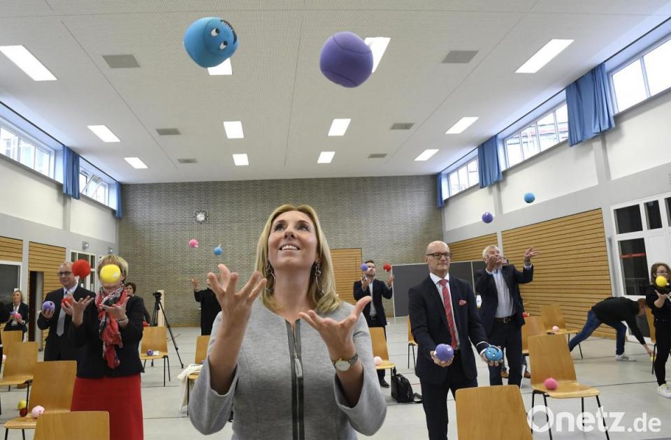 Die Klasse 10b mit Lehrer Michael Kirsch zeigte, wie das aussehen kann - und alle anderen Gäste machten gleich mit, darunter auch Handball-Weltmeister Dominik Klein, Staatssekretärin Anna Stolz und Bürgermeister Roland Strehl. Bunte Knautschbälle wurden in die Luft geworfen und je nach Farbe oder mit verschiedenen Techniken wieder aufgefangen, Konzentration und Koordination war auch bei der Finger-Übung "Klarinette" gefragt und bei "Ein Hut, ein Stock, ein Regenschirm" tippten die Anwesenden auf Zuruf mit ihren Füßen nach vorne, hinten und zur Seite.