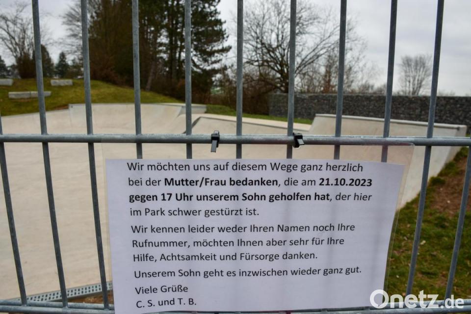 Es ist nur ein Blatt Papier, mit Kabelbindern an einem Zaun am Sportzentrum Kümmersbruck befestigt – und trotzdem eine bemerkenswerte, nette Geste: "Wir möchten uns auf diesem Wege ganz herzlich bei der Mutter/Frau bedanken, die am 21.10.2023 gegen 17 Uhr unserem Sohn geholfen hat, der hier im Park schwer gestürzt ist", ist hier, in der Nähe des Skateparks, zu lesen.