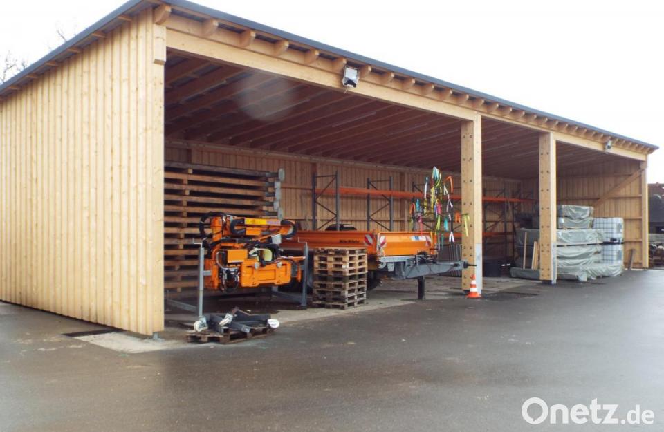 Die Bauhofmitarbeiter selbst waren es, die die Fundamente samt Betonarbeiten erstellten und die Holzfassade anbrachten. „Das ist zwar nicht die größte Baumaßnahme der Gemeinde, aber eine sehr wichtige, um einen ordentlichen Betrieb im Bauhof zu gewährleisten“, betonte Roland Strehl. Die Baumaßnahme schlug inklusive der Regale mit Gesamtbaukosten von 70.000 Euro zu Buche. Die Halle hat Abmessungen von 6 mal 25 Metern und eine Grundfläche von 150 Quadratmetern, sie weist ein Pultdach mit Blecheindeckung auf. Für den Bau verwendet wurden insgesamt 16 Kubikmeter Holz.