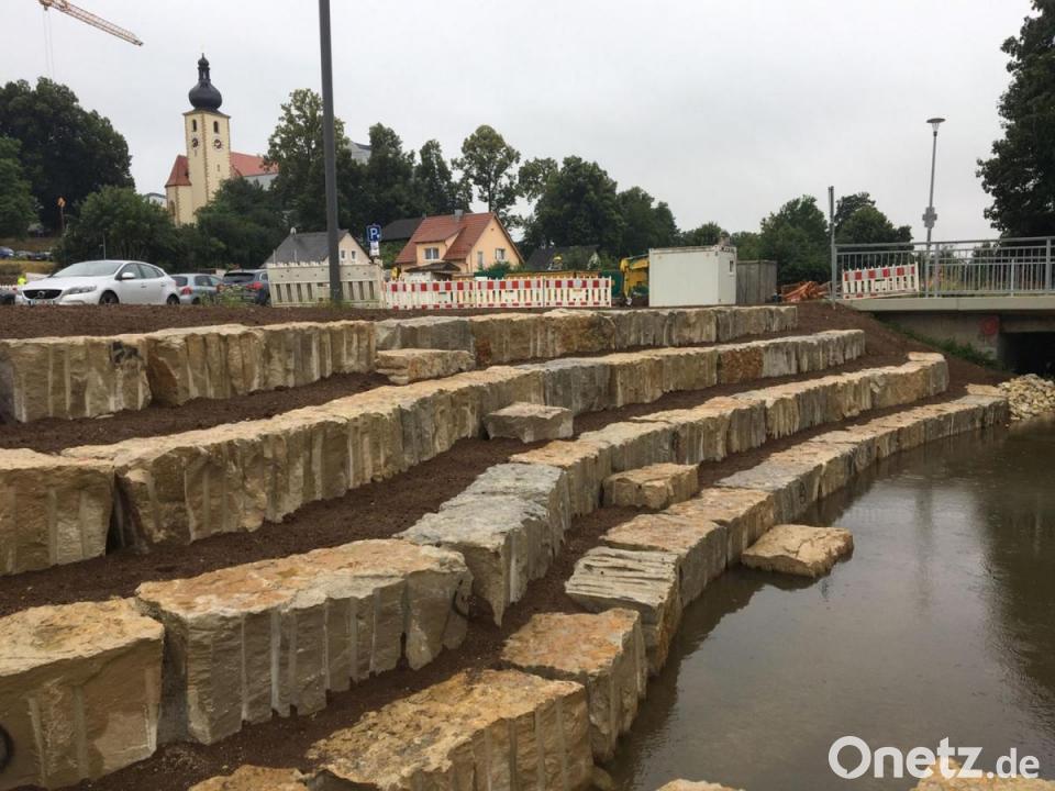 Neues Gewand für den Dorfplatz in Kümmersbruck: Die Straße ist bereits gepflastert, die Bushaltestelle mit einer großzügigen Überdachung barrierefrei erstellt. Drumherum werden gerade die Grünanlagen hergerichtet, so dass an der Steintreppe am Krumbach noch heuer der Rasen sprießen kann. Im Wasser bieten weitere Steinquader die Möglichkeit, den Bach trockenen Fußes zu überqueren: Ein idealer Spielplatz für Kinder und Spaziergänger. Der neugestaltete Platz am Stachus in Kümmersbruck nimmt damit immer mehr Gestalt an.