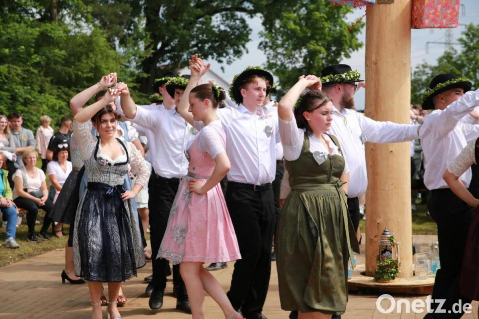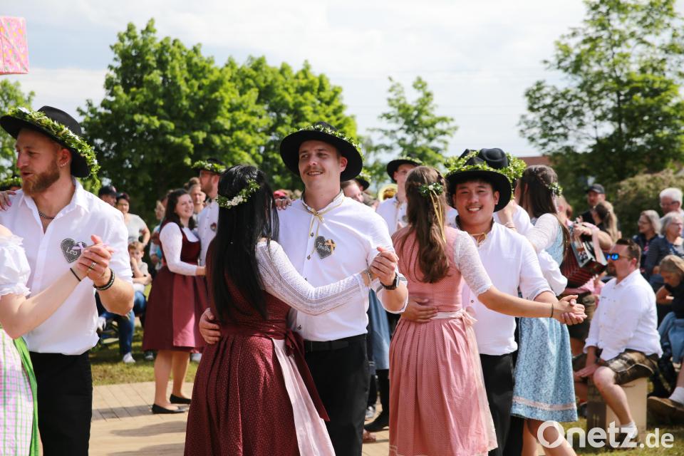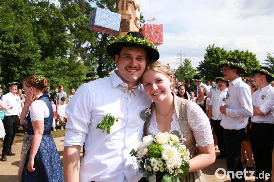 Mit einem Traktor kamen die Kirwapaare, begleitet von der Musikgruppe D’Allerscheynsten, zum Festplatz gefahren, wo sich bei ein paar Sonnenstrahlen viele neugierige Zuschauer versammelt hatten. Tanzlehrer Michael Streber hatte mit den feschen 21 Paaren viele Tänze vorbereitet. Den Abschluss bildete ein Walzer, bei dem ein Blumenstrauß seine Runden drehte. Als die Musik verstummte, war klar: Das neue Oberkirwapaar bilden Cosima Mrugalla und Tobias Käßner.