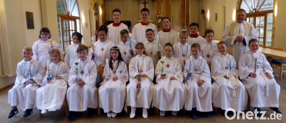 Pfarrer Markus Bruckner führte am Sonntag die 16 Erstkommunionkinder mit den Ministranten vom Martinssaal in die festlich geschmückte Pfarrkirche. Nach seinen einführenden Worten begrüßten zwei der Kommunionkinder alle Gottesdienstbesucher und dankten Bruckner, ihren Eltern, ihrer Lehrerin Christine Dötsch und Helfern aus der Pfarrei für die vorbereitende Begleitung. Alle 16 Mädchen und Buben sprachen die Kyrierufe. Dötsch trug die Lesung vor.