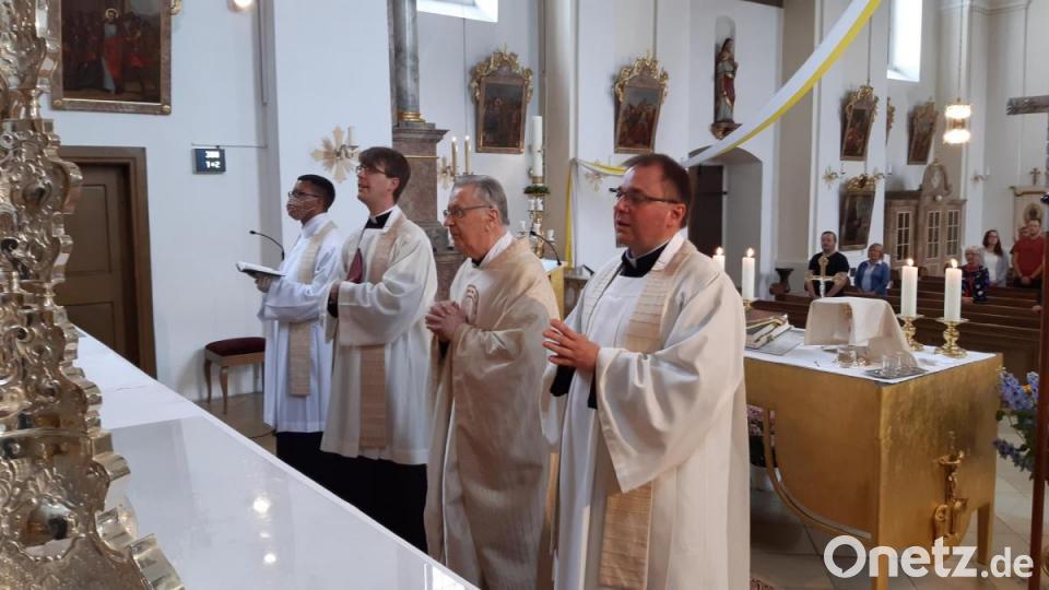 Assistiert vom Kulmainer Pfarrer Markus Bruckner, Pfarrvikar Justin Kishimbe und Pfarrer Thomas Kopp aus Altenstadt zelebrierte Albersdörfer die festliche Messe. Der aus Wunschenberg in der Pfarrei Kulmain stammende Pfarrer Kopp hatte auf Wunsch des Jubilars die Predigt übernommen. Wie dieser es wollte, beschränkte er sich auf einige wesentliche Gedanken zum Menschen und Priester Alois Albersdörfer.