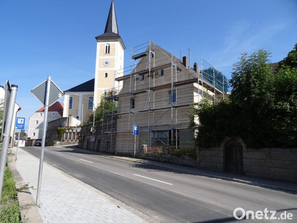 Vor dem Baubeginn im Frühjahr 2017 stimmte die Kommune die überarbeitete Planung mit der Regierung. Mitte Mai begannen die Bauarbeiten mit der Sanierung der bestehenden Grundstücks- und Außenmauern. Das bestehende Sandsteinmauerwerk wurde freigelegt, gesäubert, verkeilt und neu verfugt. Die alten Fundamentmauern des Hauses mauerte man bis zu einer Höhe von rund 60 bis 80 Zentimeter wieder auf.