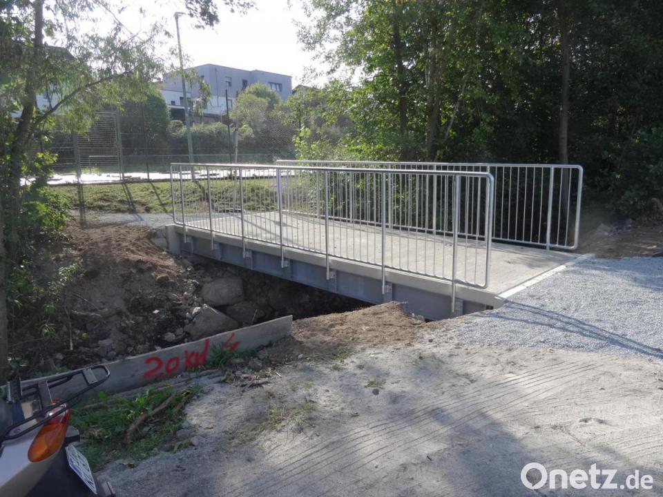In den vergangenen sechs Wochen hat die Firma Alois König aus Neuenweiher die Brückenfundamente beidseits des Bremenbaches betoniert und mit Wasserbausteinen gesichert. In der Vorwoche erfolgte die Installation der von der Firma Markgraf vorgefertigten Stahlbrückenkonstruktion samt Betonfertigteil als Brückenbelag. Ein 1,2 Meter hohes Geländer sorgt für ausreichende Absturzsicherheit für Fußgänger und Radfahrer. Gleichzeitig wurde 70 Meter bachaufwärts die bestehende Fußgängerbrücke zur Tennisanlage in Stahlbauweise erneuert, an der noch Restarbeiten zu erledigen sind. Die geplanten Maßnahmen zur Erneuerung der beiden Brückenbauwerke über den Bremenbach am Sportgelände waren vorher konzeptionell und wasserbautechnisch mit dem Wasserwirtschaftsamt erörtert, abgestimmt und wasserrechtlich genehmigt worden.