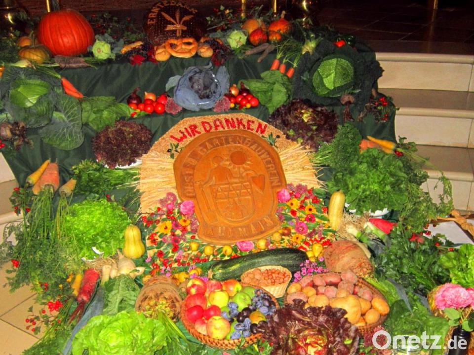 Der Obst- und Gartenbauverein ließ mit der Kirchengemeinde eine alte Tradition zum Erntedankfest in der Marienkirche aufleben. Vorstand und engagierte Mitglieder bauten unter Federführung von Renate Weber und Georg Schraml vor dem Hauptaltar einen reich und bunt bestückten Erntedankaltar auf. Alle Früchte der heimatlichen Gärten, Fluren und Äcker, die die Initiatoren zusammengetragen hatten, finden sich darin wieder. Die beiden Hauptakteure formten sie zu einem kleinen Kunstwerk, das die Gläubigen beim Besuch des Vorabendgottesdienstes am Samstag erstmals bewundern konnten. Rund um das geschnitzte Vereinswappen legten sie Weintrauben, Blau- und Weißkraut, Porree, Wirsing, Salate, Kürbisse, rote und gelbe Rüben, Sellerie, Rettich, Paprika, Zwiebeln, Kartoffel, Zucchini, Gurke, Tomaten und Obst.