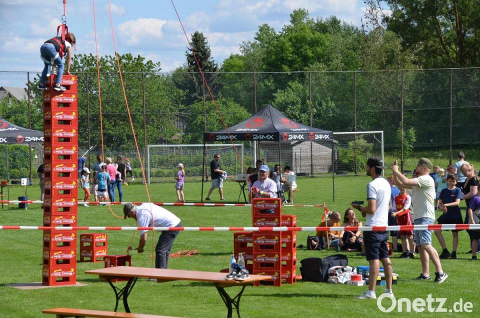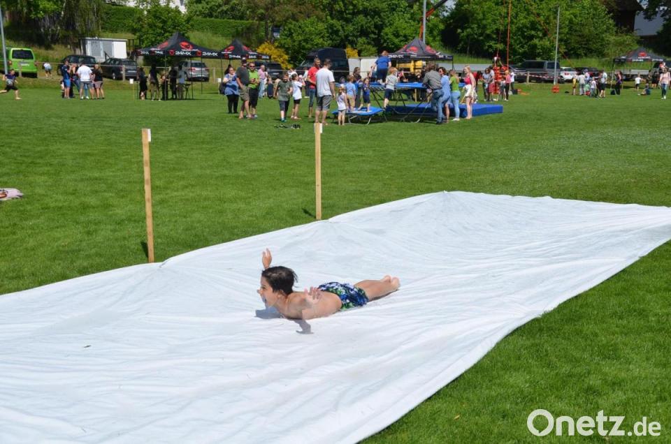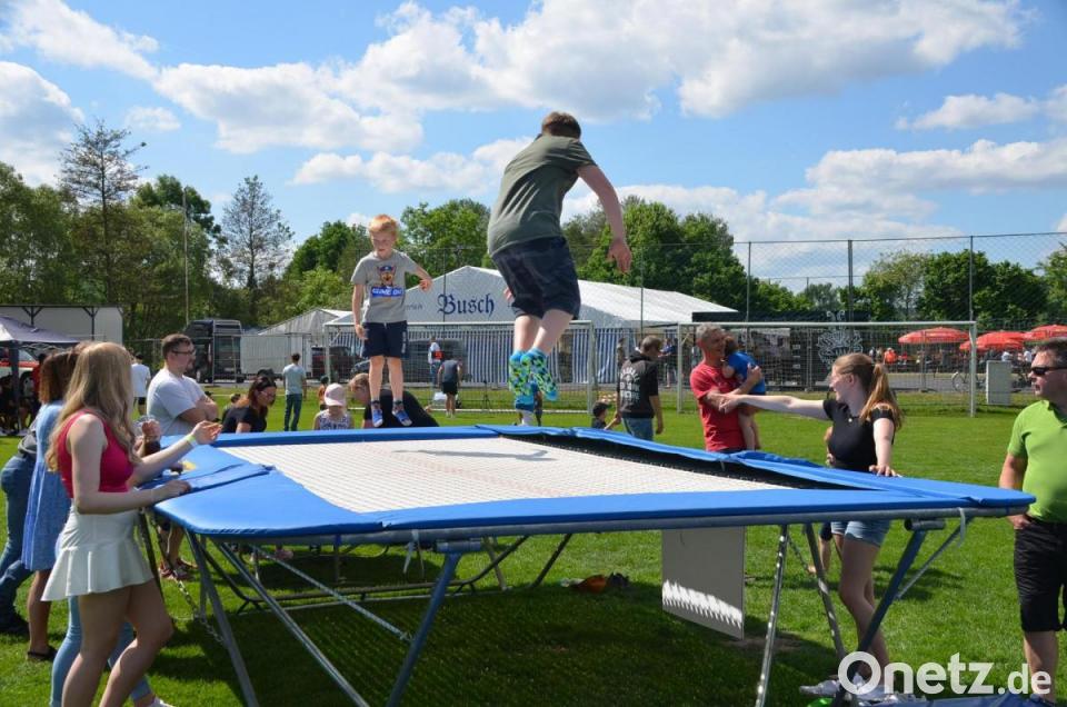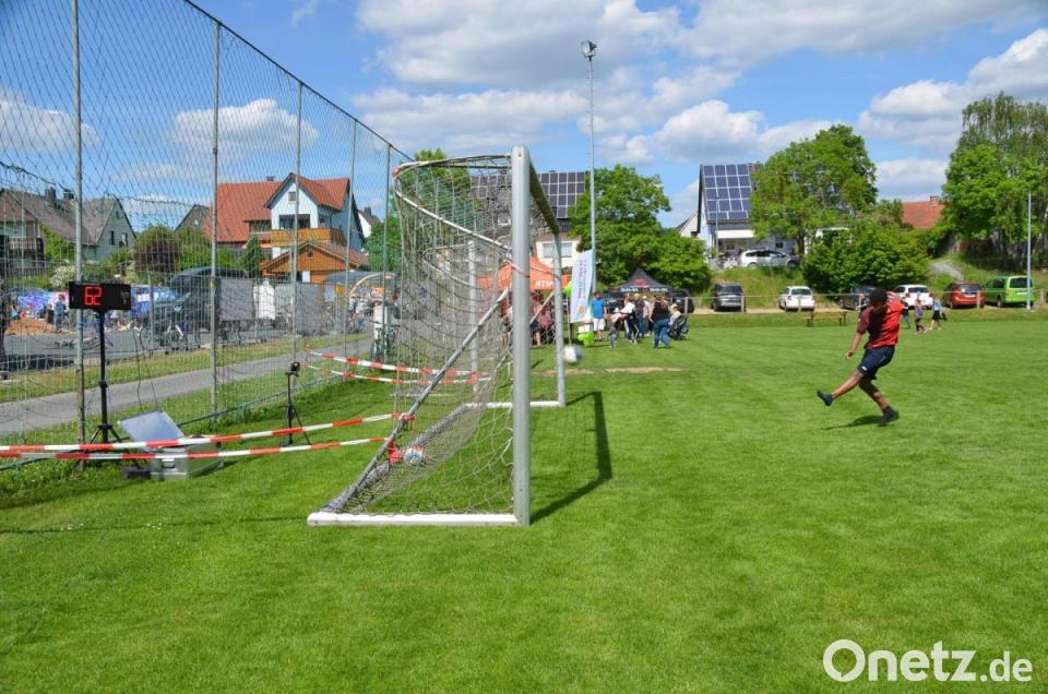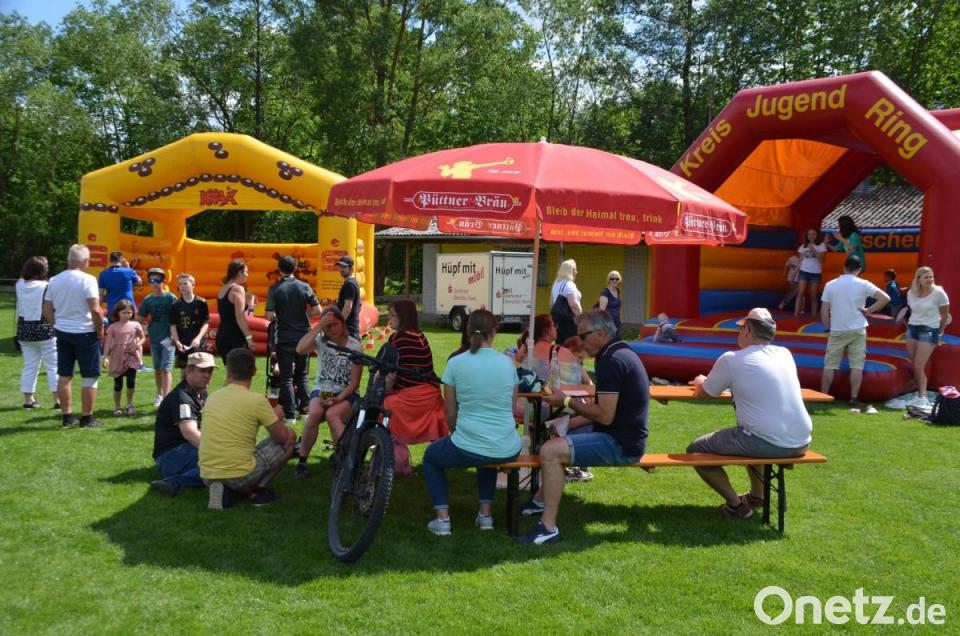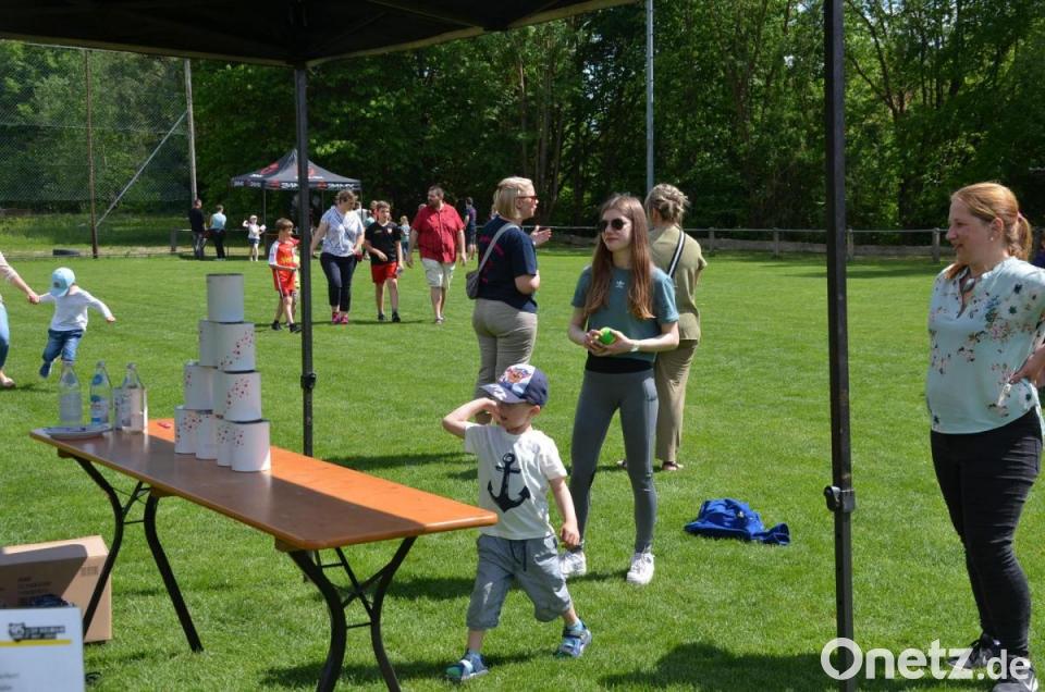 Bereits zu Beginn des Wettbewerbes bevölkerte eine Vielzahl von Teilnehmern den zum Wettkampfgelände umgestalteten B-Platz. Dort hatten die SV-Aktiven eine Spiel- und Spaßarena mit vielen Stationen aufgebaut. Geschicklichkeit und Treffsicherheit waren an der Spickerscheibe, beim Zielwurf, Dosen- und Ringwerfen und auf der Holzkegelbahn gefragt. Die Mädchen und Buben mussten einen Tennisball auf dem Schläger jonglieren. Ihre praktischen Fertigkeiten brachten beim Wasserabfüllen, Kirschkernspucken wertvolle Punkte. Um die schnellste Zeit ging es beim Hindernisparcours, der mit einem Bobby-Car bewältigt werden musste. Wertvolle Punkte waren beim Weitrutschen auf einer nassen Siloplane zu holen. Zwischen den Wettbewerben zeigte die Judoabteilung Einlagen ihres Kampfsports. Beim V-max-Wettbewerb suchte der SV den schussstärksten Fußballer der nördlichen Oberpfalz. Alle Sieger und Bestplatzierten erhielten kleine Sachpreise bei der Siegerehrung. Die Mädchen und Buben konnten zudem in und auf einem Mega-Sandhaufen wühlen und sich auf zwei Hüpfburgen vergnügen. Dazu sorgten Kinderschminken, Riesentrampolin und Bierkasten-Stapeln für Kurzweil. Riesig war auch der Besuch der Eltern und Festgäste, die es sich mit Kaffee und Kuchen der Fußballfrauen unter Sonnenschirmen vor dem Festzelt gutgehen ließen. Dazu gab es ein reichhaltiges Speisen- und Getränkeangebot.