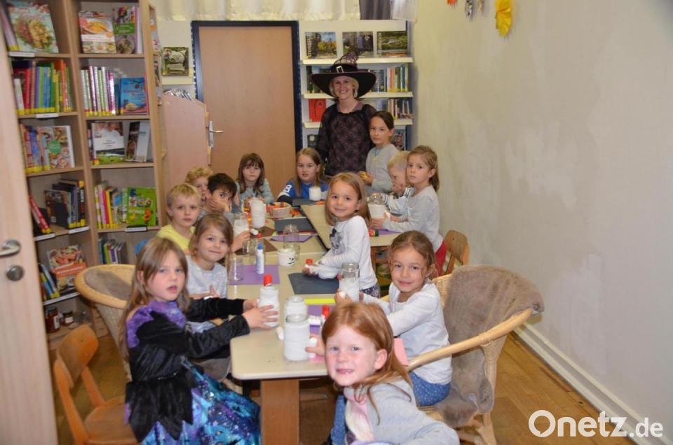 Das zweite Buch „Willkommen im Spukschloss“ von Maja von Vogel und Monika Parciak führte die Kinder in Gedanken mit zu Bens Gruselparty. Zu der ist auch Lia eingeladen, die sich als Hexe verkleidet hat, Ben ist als Vampir kostümiert. An der Decke hängen Fledermäuse und zu essen gibt es leckere Spinnenbeine. Mit Lia lüften die kleinen Zuhörer das von Ben gehütete Geheimnis. Zum Ende der Gruselstunde waren die 13 Kinder zum Basteln eingeladen. Unter Anleitung des Büchereiteams und der Vorleserin fertigten sie Windlichter.