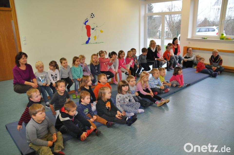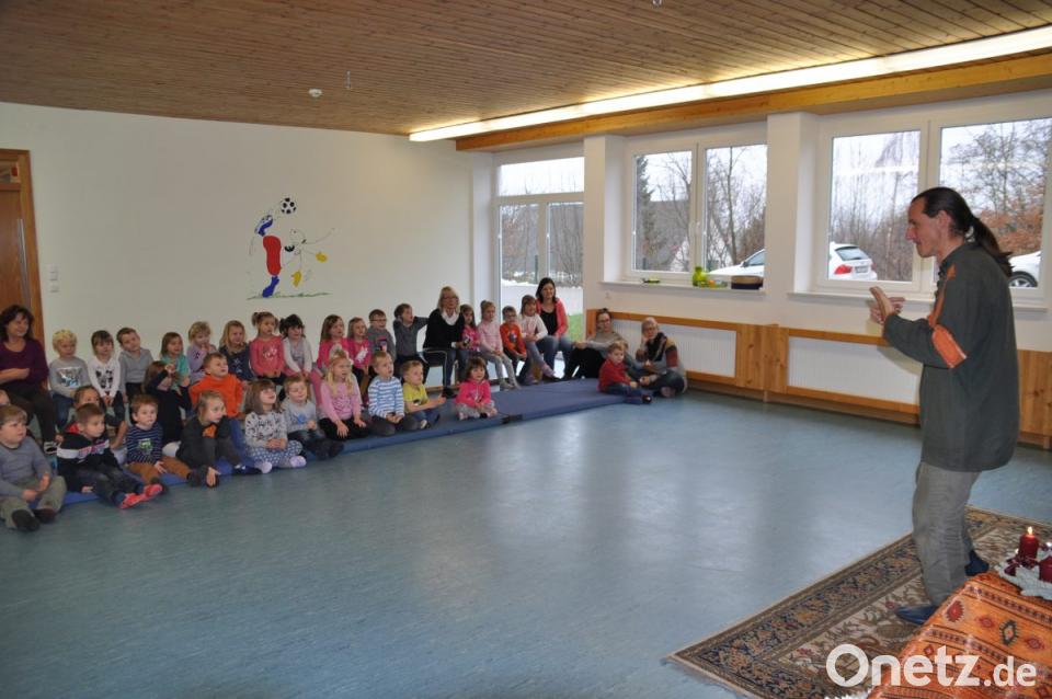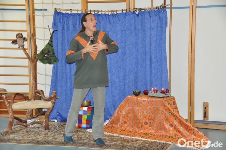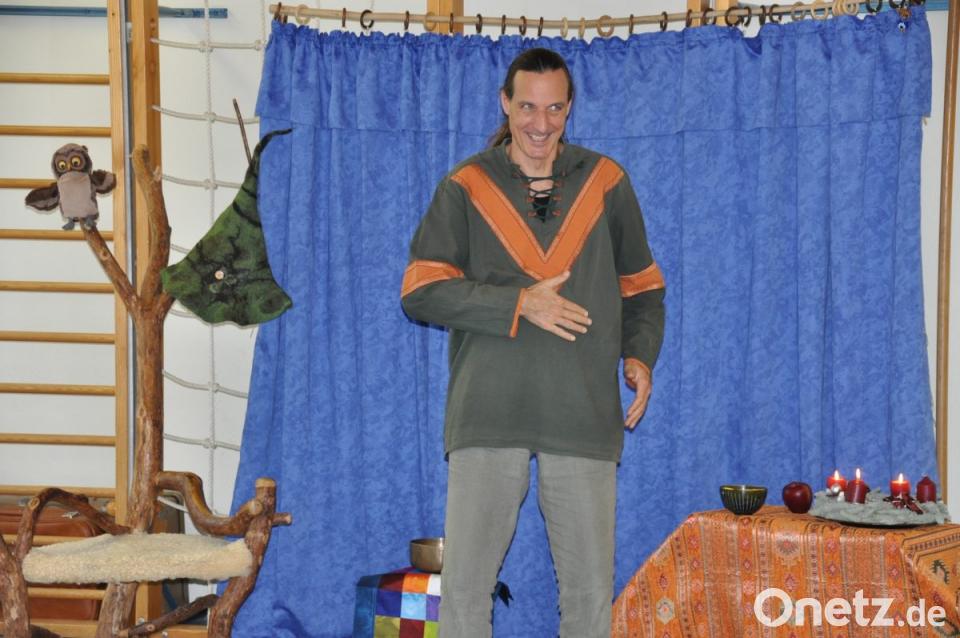 Aber nicht nur die Ein- bis Dreijährigen konnte er für das älteste Hörbuch "Märchen" begeistern, sondern auch die Kindergartenkinder. "Das Winterlager der Tiere" hieß das altersgerechte Märchen um fünf Tiere auf einem Bauernhof. Mit wechselnd-spannender, sonorer aber auch beruhigender Stimme mimte er Ochs, Schwein, Hahn, Hammel und Gans. Sie fliehen in den Wald, um nicht im Winter als Weihnachtsbraten zu enden. Nach dem schönen Leben im Sommer steht der kalte Winter vor der Tür. Das Ziel des Ochsen, ein Häuschen zu bauen, teilen die anderen nicht. Er als Frost und Schnee den Wald erstarren lassen, erkennen sie, dass Zusammenhalt doch am besten ist. So ziehen sie mit mancher Drohung ins Haus des Ochsen ein und können zusammen am Ende sogar den Wolf und den Bären besiegen. Mit seiner deutlichen Sprache und Mimik zog der Märchenerzähler die uneingeschränkte Aufmerksamkeit auf sich und seine Helden im Märchen.
