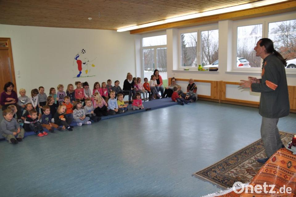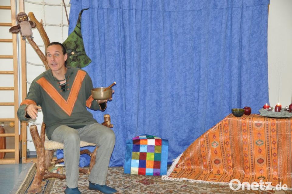 In die Welt des Märchens und der Fabel schickte das Kinderhaus Mobile seine Schützlinge. Zu Gast war Märchen-Erzähler Olivier Machander aus Hainsacker. Von seinem ältesten Sohn und einem Clown inspiriert, wurde Machander zum Märchenerzähler. Er hatte sich im Turnraum seine mit Hexenstuhl und -hut dekorierte Erzählecke eingerichtet und empfing dort seine kleinen Gäste mit einem Blick und kräftigen Rühren in seiner Märchenschale. Zuerst waren die Krippenkinder aufmerksame Zuhörer.