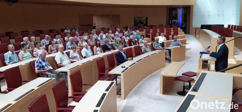 Die Kulmainer nutzten die Zeit vor dem Besuch im Landtag zu einem Stadtbummel. Gegen Mittag ging es dann durch den Sicherheitscheck in die Landtagsgaststätte. Nach der Mahlzeit bekamen die Teilnehmer eine kurze Führung durch das Landtagsgebäude, mit Erläuterungen zur Geschichte des Bauwerks und zu geplanten Veränderungen. Anschließend führte MdL Reiß die Kulmainer Gäste in den Plenarsaal.