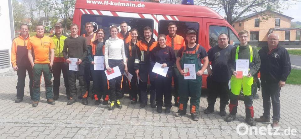 Aktive der Feuerwehren Kemnath, Kulmain, Oberwappenöst und Zinst haben erfolgreich einen Kurs über den Umgang mit Motorsägen absolviert. Die Branschüter aus Kulmain hatten den Kurs organisiert. Als Lehrgangsleiter fungierte Kreisbrandmeister Peter Prechtl, der von zwei Mitarbeitern der Bayrischen Staatsforsten tatkräftig bei der praktischen Ausbildung am Gerät unterstützt wurde.