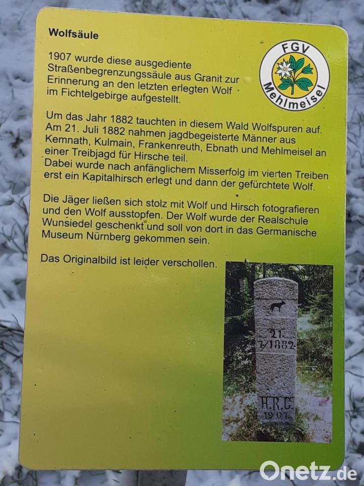 1882 wurde der letzte Wolf im Fichtelgebirge erledigt. Dem Kulmainer Gastwirt Martin Wiesend gelang es, den "gefürchteten Feind" niederzustrecken. 1907 wurde in Erinnerung an dieses Ereignis am Scheibenberg eine Säule errichtet: die sogenannte Wolfssäule. Martin Wiesend aus Kulmain (einheimisch Kulma) war der "Held" des Ereignisses.