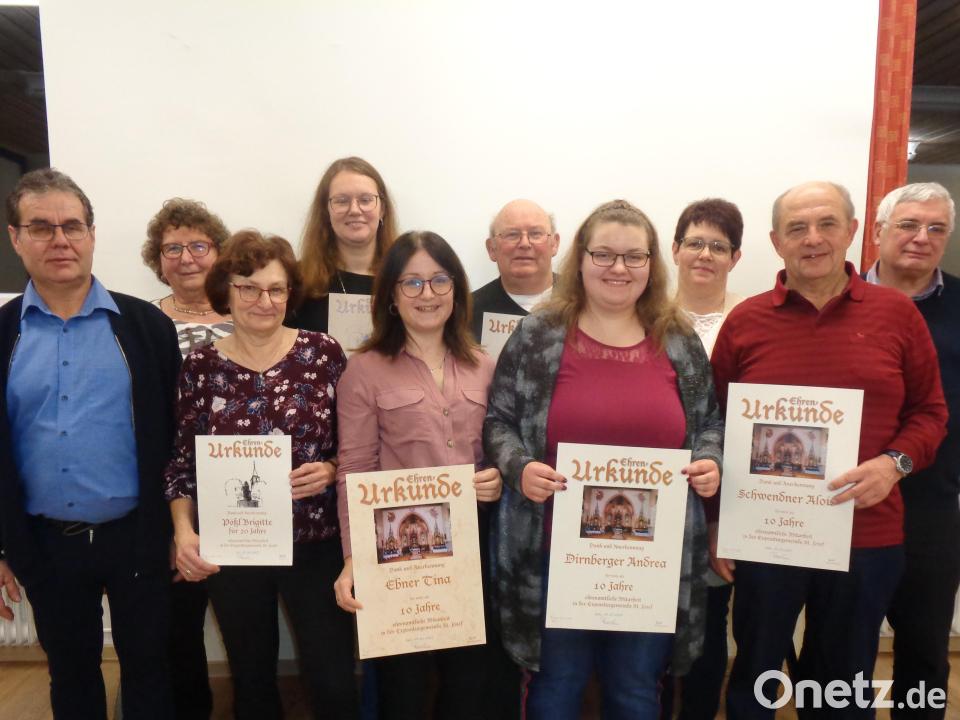 Für zum Teil schon jahrzehntelanges Engagement im kirchlichen Bereich ehrten Pfarrer Wismeth, Kirchenpfleger Brandl und Pfarrgemeinderatssprecherin Karin Held mehrere Mitarbeiter mit einer Urkunde und einem kleinen Präsent. Zehn Jahre unterstützen Andrea Dirnberger und Tina Ebner schon den Kirchenchor. Alois Schwendner trägt seit zehn Jahren die Verstorbenen mit auf ihrem letzten Weg.