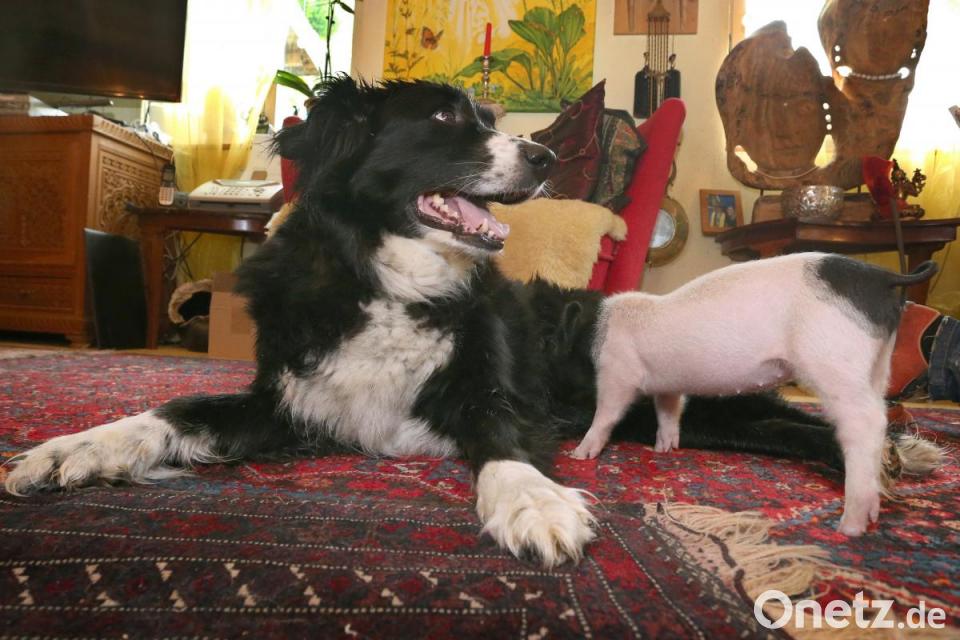 „Rosa von Schwarte“ heißt die Babysau. Sie grunzt und schmiegt sich unter das schwarz-weiße Fell der Border-Collie-Dame Molly. Mit dem Rüssel sucht Rosa nach einer Zitze und nuckelt, während Molly mit dem Schwanz wedelt.