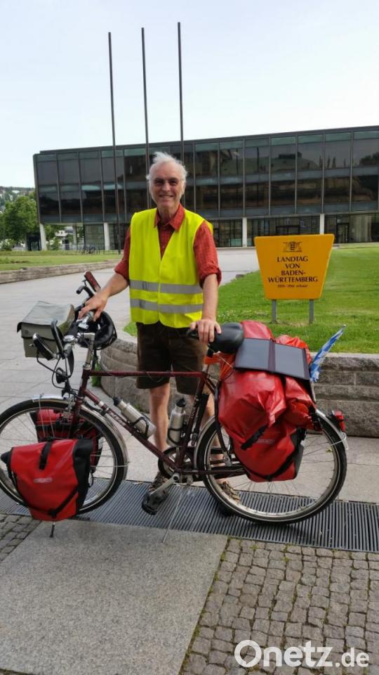 Bundesländer-Radler Karlheinz Weigl hat wieder sein Etappenziel nach 78 Kilometern erreicht. Seine Route führte durch Kirchheim unter Teck nach Wernau bei Plochingen. Von da an ging es immer am Neckar entlang. "Der Radweg war zwar geteert, aber dermaßen holprig - eine Zumutung. Vorbei an Esslingen, wo ich eine Bekannte kurz besuchte, radelte ich nach Stuttgart weiter. Einmal hörte der Radweg an einer Treppe auf. An einer Seite war zwar eine Schiene angebracht, aber für meine breite Fuhre (knapp 50 Kilo) ungeeignet. Langsam und vorsichtig mit Zuhilfenahme der Handbremse meisterte ich das Hindernis. Je näher ich dem Zentrum kam, desto mehr Baustellen und Umleitungen, die mich und mein Navi orientierungsmäßig forderten. Doch einmal an einer großen Baustelle mit vielen verschiedenen Möglichkeiten zu fahren wussten wir beide nicht mehr weiter. Zum Glück kamen fünf junge Polizisten des Wegs, die mir die Richtung zum Landtag zeigten. Nach einer kurzen Strecke war ich dort und begab mich zur Pforte. Nachdem ich mein Anliegen vorbrachte, teilte mir die Dame mit Bedauern mit, dass sie keinen Stempel hätte, sondern nur die Kollegen in der Poststelle, und die wären seit Mittag im Feierabend. Enttäuschung! Ich konnte sie überreden, wenigsten einen handschriftlichen Eintrag mit Unterschrift zu machen.