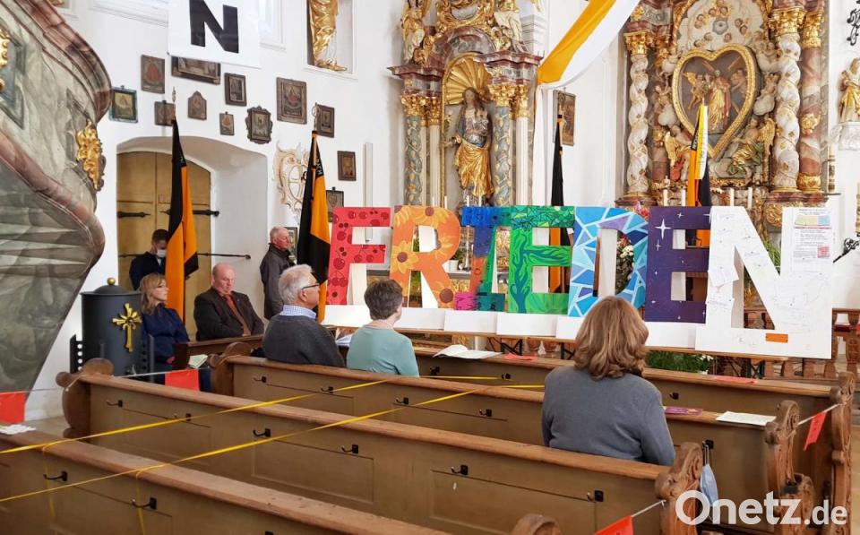 Heuer trugen beim Einzug in die Kirche Jugendliche sieben Lettern aus Holz, die zusammen gelesen das Wort "FRIEDEN" ergaben. Passend zum Leitthema waren auch die Fürbitten gewählt. Mit Freundschaftsbändern an den Händen, Friedenslichtern vor dem Gnadenaltar und dem Lied "Wir sind Kolping, Menschen dieser Welt" brachten die Pilger, trotz räumlichen Abstands, ihre Verbundenheit über die Grenzen von Gemeinden und Landkreisen zum Ausdruck.