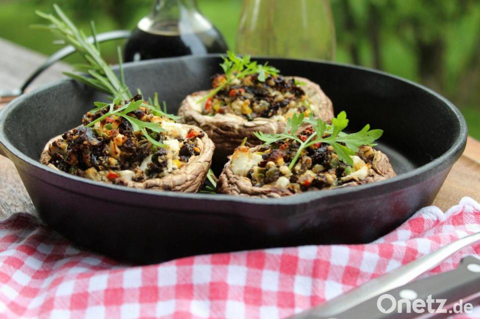 Die gefüllten Champignons können auf dem Grill oder im Backofen zubereitet werden. "Man muss nur schauen, dass nicht zu viel Hitze im Spiel ist. 180 bis 200 Grad reichen locker." Wann der gefüllte Pilz fertig gegart sei, könne man schwer exakt sagen. "Denn: Es kommt zum einen darauf an, wie groß dieser ist und wie komprimiert die Füllung. Einfach nach 25 Minuten den ersten anschneiden und probieren. Das gehört ja auch irgendwie zum Kochen und Grillen dazu."Extratipp für die gefüllten Riesenchampignons:"Stopft die Füllung nicht übermäßig dick und hoch aufgetürmt in die Champignons. Diese ziehen sich beim Grillen oder Backen leicht zusammen. Nicht, dass Teile der Füllung durch den Grillrost fallen."