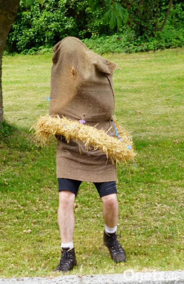 Nötig hat der arme Tropf es allemal, nicht immer herrschen an Pfingsten sommerliche Temperaturen. Außer einer Badehose ist der Pfingstschwanz einzig und allein mit dem triefenden Jutesack bekleidet.