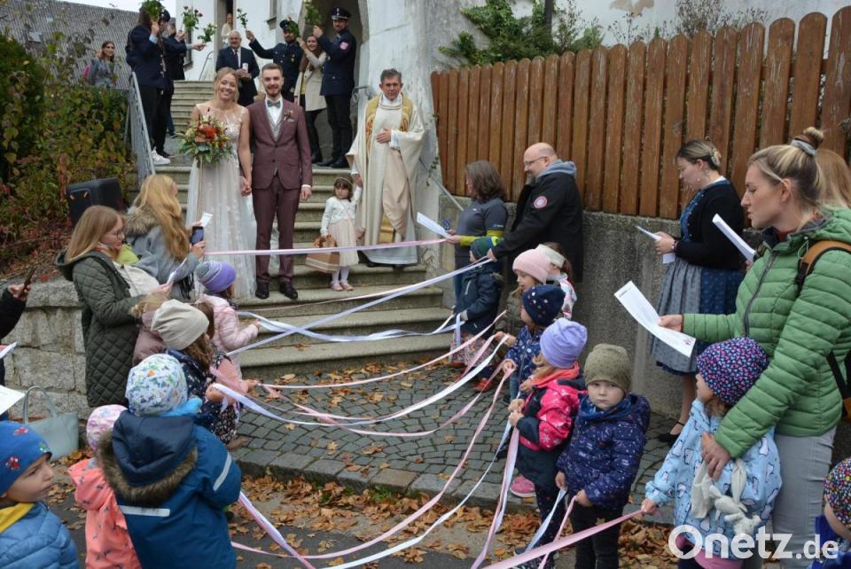 Nach der Trauung erwarteten die Feuerwehr Großensees sowie rund 40 Kinder des Mitterteicher Kinderhauses „Purzelbaum“ die frisch Verheirateten mit einem Ehrenspalier. Die Braut ist in der Einrichtung Stellvertretende Leiterin. Die Kinder überraschten das Ehepaar mit einem eigens getexteten Hochzeitslied, das das Brautpaar sehr rührte. Nach einem kurzen Imbiss und Sektempfang ging es mit dem Hochzeitsauto, einem Audi RS Q8, über Konnersreuth nach Arzberg in den „Bergbräu“ zur weltlichen Feier.