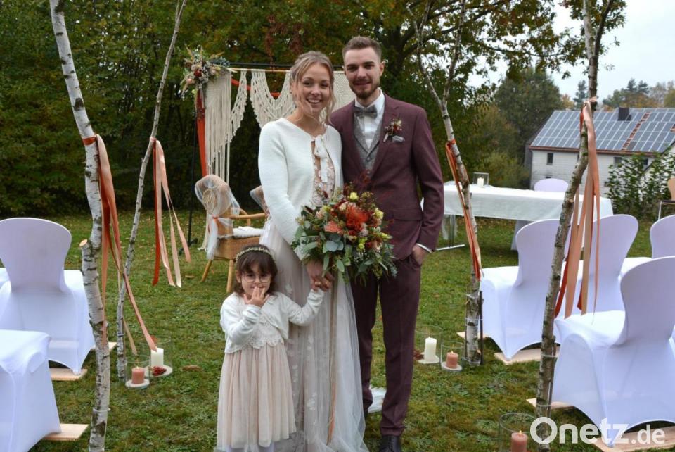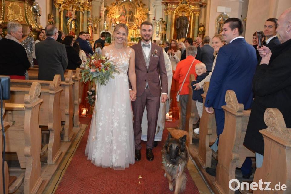 Ihren besonderen Tag erlebten am Samstag Erzieherin Verena Burger und Softwareentwickler Fabian Berr. Die 26-jährige Themenreutherin und ihr gleichaltriger Freund aus Wiesau heirateten zunächst im Leonberger Pfarrgarten standesamtlich vor Standesbeamtin Luisa Kamm. Es war die erste Trauung im Freien im Pfarrgarten überhaupt, das schöne Herbstwetter machte dies möglich. Musikalisch umrahmt wurde die Zeremonie von Solistin Luisa Zeitler. Freunde des Paares luden die Hochzeitsgesellschaft anschließend zu einem Stehempfang ein. Unmittelbar nach der standesamtlichen Trauung ging es in die benachbarte Pfarrkirche St. Leonhard zur kirchlichen Hochzeit. Pfarrer Max Früchtl aus Floß traute das Paar, die Feier wurde musikalisch vom Chor „Grazie A Dio“ umrahmt. Der Belgische Schäferhund „Calea“ brachte die Trauringe zum Altar.