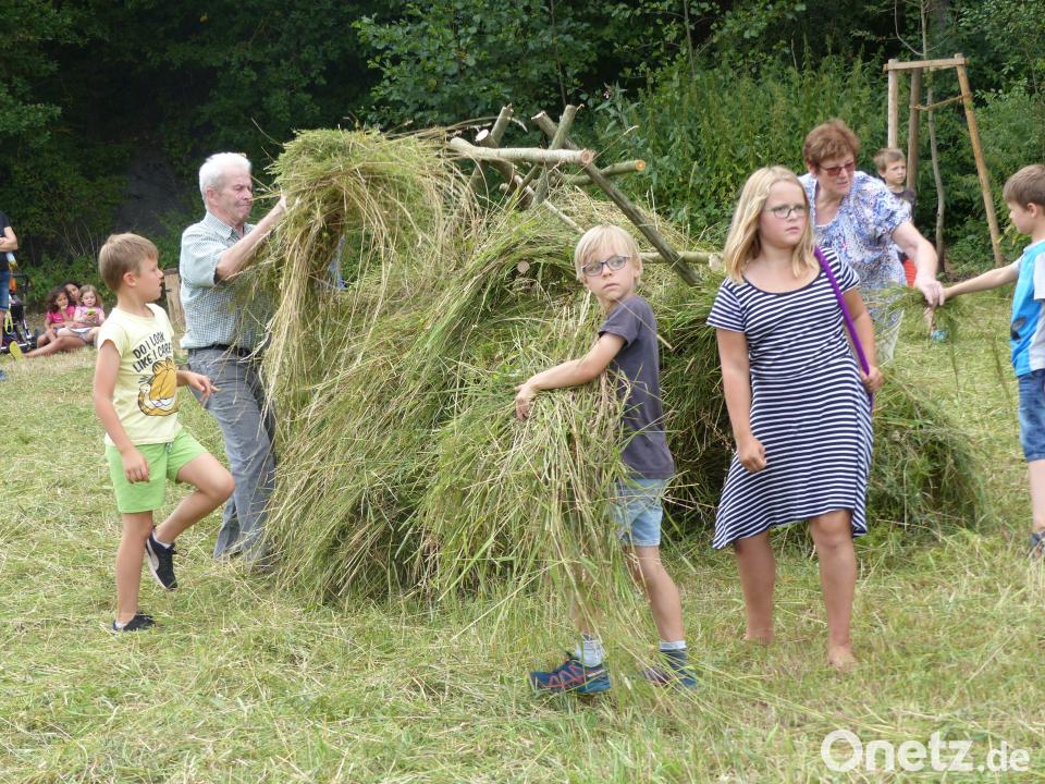 Viel Arbeit stand beim jüngsten Treffen am Wochenende an, denn die Aktionswiese war zu mähen und das mit der Sense gemähte Heu zu machen. Dazu kam Sensenspezialist Werner Luber aus Bernricht, der auch das Dengeln der Sense und die richtige Handhabung zum Grasmähen zeigte. Das Gras wurde danach auf Gestelle (Heinzen) aufgehängt, damit es trocknen kann und zu Heu wird. Zum Schluss stellte Konrad Hubmann eine Bienenbeute auf der Wiese auf. Bis Oktober werden die jungen Teilnehmer noch vieles lernen - das Finale ist das Pressen des eigenen Apfelsafts.