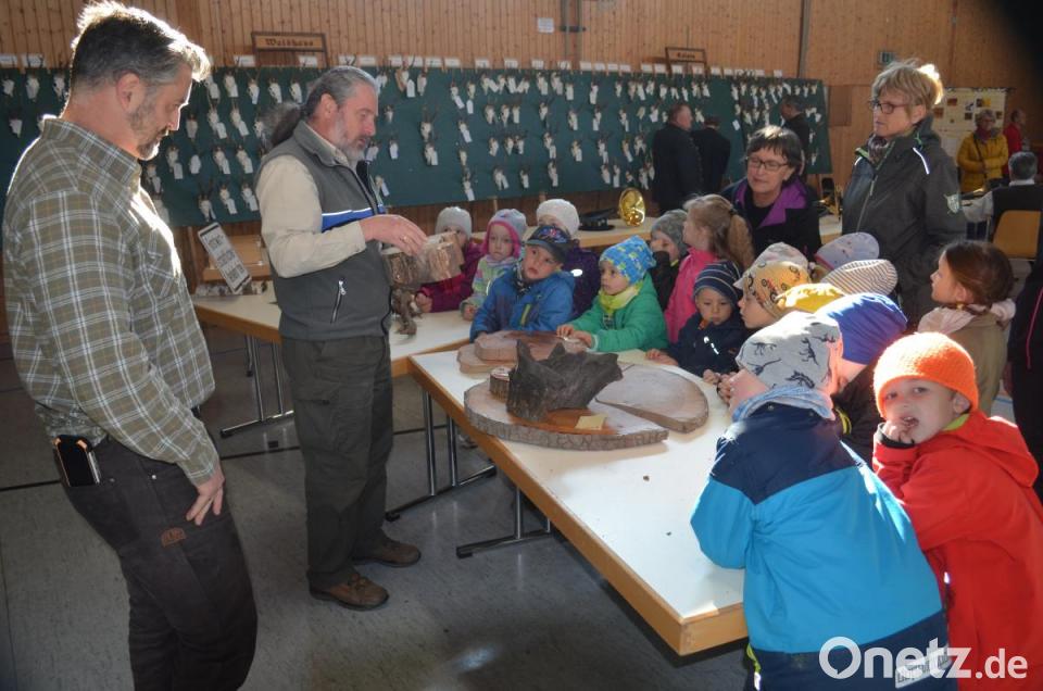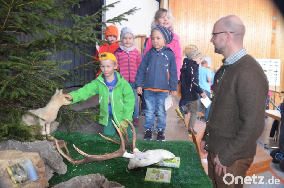 Die Kreisgruppe Vohenstrauß im Bayerischen Jagdverband (BJV) mit Vorsitzendem Christian Ertl nutzte den Aufbau zur bevorstehenden Hegeschau am Sonntag und gab rund 100 Kindern Einblicke in die Natur. Mit dabei waren Mädchen und Buben vom Kindergarten und der Grundschule Leuchtenberg sowie vom Förderzentrum des HPZ in Irchenrieth mit insgesamt 15 Betreuern. Die Grenzlandbläser bereiteten den Empfang mit Jagdhornklängen. Die Kinder staunten über die 200 Geweihe an den Stellwänden wie über die Reihe präparierter Wildtieren und rätselten, um welches Tier es sich jeweils handelte. Der Star darunter war ein von Josef Hartwig erlegter weißer Fuchs. Am Beispiel der Gehörne und Geweihe lernten die Mädchen und Buben, ob es sich um einen Hirsch oder Rehbock handelt, und wie das Alter bestimmt wird.
