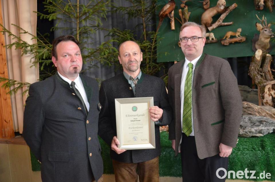 Die Kreisgruppe Vohenstrauß im Bayerischen Jagdverband (BJV) ehrte Eduard Forster vor kurzem bei der Hegeschau. Der Eslarner leitet seit 33 Jahren die Jagdhornbäsergruppe „Grenzlandbläser“ und ist obendrein in der Jagd sehr engagiert. Unter dem Applaus der vielen Waidmannskollegen überreichten Bezirksvorsitzender Alexander Flierl und der Kreisgruppenvorsitzende Christian Ertl für Forsters besondere Verdienste um das Jagdwesen in Bayern den „Ehrenkranz in Bronze“ mit der dazugehörenden Urkunde.