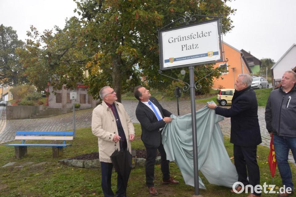 "Wenn wir uns in Zukunft zum Fronleichnamszug aufstellen, dann nicht mehr unterhalb der Kirche, sondern am ,Pfreimder Platz'. Und das Kriegerdenkmal und die Feier zum Volkstrauertag ist nicht mehr am Buswendeplatz, sondern am ,Grünsfelder Platz'", stellte Bürgermeister Kappl heraus. "Eure Orte, meine lieben Freunde, spiegeln sich nach der Enthüllung der Ortsschilder nun in Leuchtenberg wider", sagt er zu den Pfreimdern und Grünsfeldern. "Für unsere Stadt ist es eine große Ehre, an ihrem geschichtlichen Ursprungsort nun auch sichtbar zu sein", erwiderte Bürgermeister Jochen Market. Der Bürgermeister der Residenzstadt Pfreimd der Landgrafen von Leuchtenberg, Richard Tischler, hielt ein Plädoyer auf die Partnerschaft, die nicht nur in der Politik der Kommunen, sondern auf allen Ebenen gelebt werden soll. "Keine Freundschaft auf dem Papier", betonte der Pfreimder Stadtchef. "Ich freue mich, dass Pfreimd ein Teil der Geschichte der Leuchtenberger ist", sagte Tischler. Die drei Bürgermeister brachten auch zum Ausdruck, dass in den drei Partnergemeinden große historische Jubiläen anstehen. Pfreimd feiert dieses Jahr 650 Jahre Stadterhebung, Grünsfeld begeht die 700-Jahr-Feier und Leuchtenberg 2024 die 850-Jahr-Feier. Den historischen Akt der Namensgebung vollzogen die drei Bürgermeister dann am Grünsfelder und Pfreimder Platz durch die Enthüllung der Gedenktafeln.
