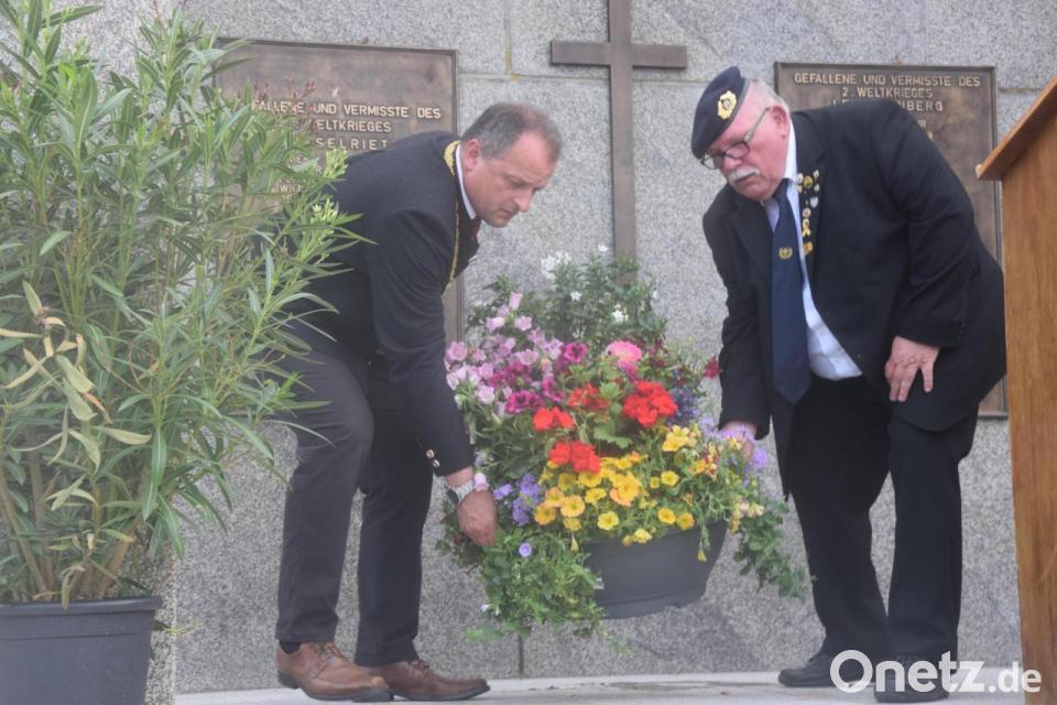 Zum Gedenken stellten Berger und Kappl am Ehrenmal eine Blumenschale auf. Mit der Nationalhymne endete die Feier am Kriegerdenkmal. Es folgte der Zug zur Mehrzweckhalle mit der Verleihung der Veteranenabzeichen. Geehrt wurden: Karl Liebl, Gerhard Lingl, Johann Hanauer (Soldaten und Reservistenkameradschaft Moosbach), Brian Berger, Norbert Grandt, Josef Schreml, Bernhard Einweg (Reservistenkameradschaft Pleystein), Christian Roderer, Josef Kreisl, Günther Schober, Martin Lang, Eduard Schwägerl, Richard Meier (Soldatenverein Vohenstrauß), Alfred Kick, Georg Kraus (Krieger- und Soldatenverein Leuchtenberg), Roman Bauer, Michael Beer, Harald Piehler, Michael Prößl, Albert Pühler, Max Kick, Thomas Zellner (Krieger- und Reservistenverein Waldthurn), Markus Götz und Nico Marschalt vom 5. Panzerbataillon 104 erhielten die Ehrennadel in Gold und Leuchtenbergs Bürgermeister Anton Kappl das BSB-Verdienstkreuz 1. Klasse.