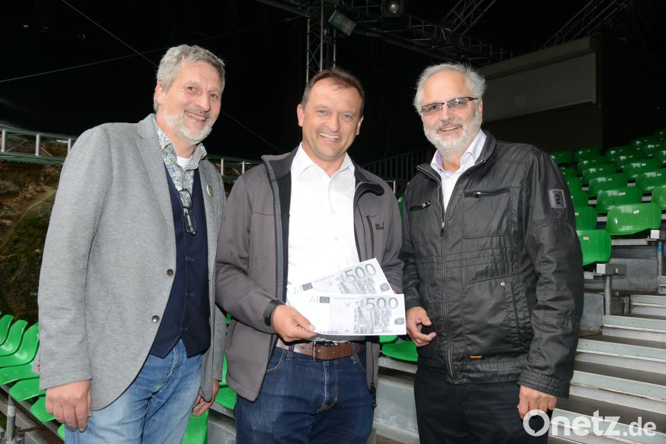 Leuchtenbergs Bürgermeister Anton Kappl (Mitte) überreicht symbolisch zwei überdimensionale 500 Euro-Scheine an Reinhard Kausler, Vorsitzender der Stadtbühne Vohenstrauß (rechts), als Beitrag zur Finanzierung der neuen Bühnenüberdachung. Wolfgang Meidenbauer, Geschäftsführer des Landestheater Oberpfalz (links) freut sich, dass die Zuschauer künftig wieder unabhängig von Wettereinflüssen die Aufführungen genießen können.