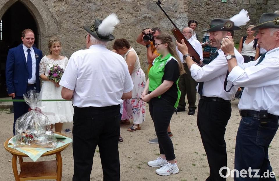 Musikalisch wurde die Feier vom Trio "Z's" festlich umrahmt. Nach der offiziellen Zeremonie in der Burgkapelle war ein langer Weg durch viele Verein vorbereitet. Den ersten Verein bildete der Schützenverein 1864 Waidhaus, für den dritter Schützenmeister Willi Helgert das Paar mit einem Spruch beglückwünschte. Vereinschef Rudolf Grundler senior war freilich auch anwesend, hatte diese Aufgabe jedoch als Vater des Bräutigams in die Hände eines Vertreters gelegt.