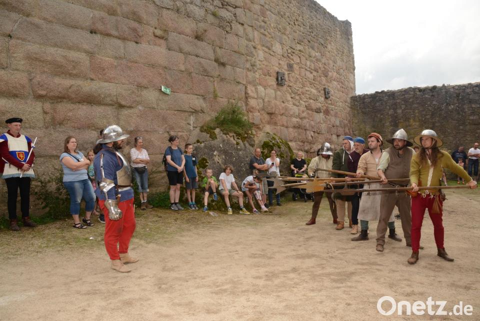 Im Hof bei der Burgkapelle zeigte eine Gruppe unter Führung des „Herrn Leutnants“ den „Stangenwaffen-Drill“ aus dem Jahr 1474, der hier vor allem dazu dient, die Mitwirkenden, die sonst nicht gemeinsam auftreten, auf eine Linie zu bringen. Dazu gab es entsprechende Kommandos, damit auch die Zuschauer den im früheren Kriegsfall erforderlichen Umgang mit der Stangenwaffe verstanden.