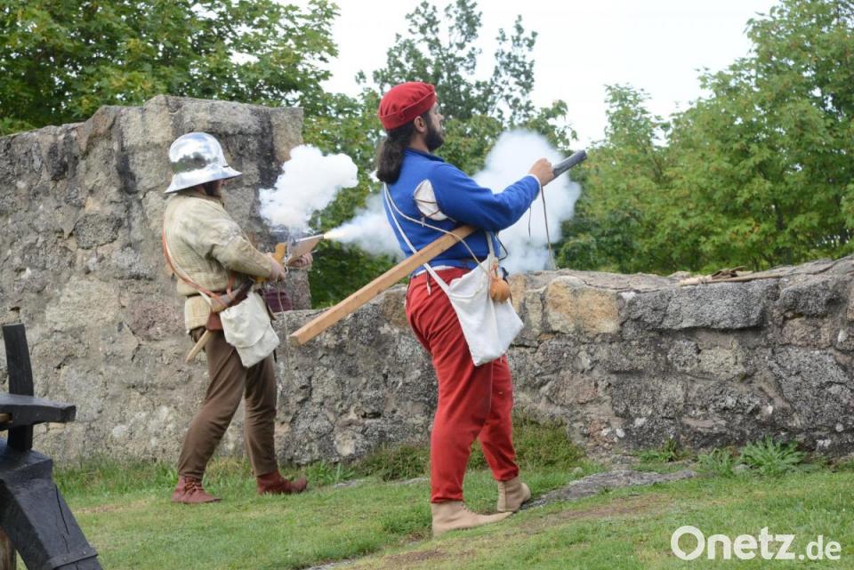 Der Samstagnachmittag startete dann mit einer Vorführung von mittelalterlichen Schusswaffen. Wichtigster Rat an die Besucher: „Haltet euch die Ohren zu und öffnet den Mund, um die Druckwelle zu vertragen“. Nach ausführlichen Erklärungen wurden die unterschiedlichen Waffen geladen. Doch das war nicht so einfach. Denn in jeden Lauf der Handfeuerwaffen muss das Pulver eingefüllt und per Hand fest gepresst werden, bevor es mit der Lunte entzündet werden kann. „Vorderlader“ nennen sich diese Handfeuerwaffen, die dann mit klarem Feuerstrahl die – hier natürlich nicht vorhandene Kugel – in die gegnerischen Reihen schießen würden.
