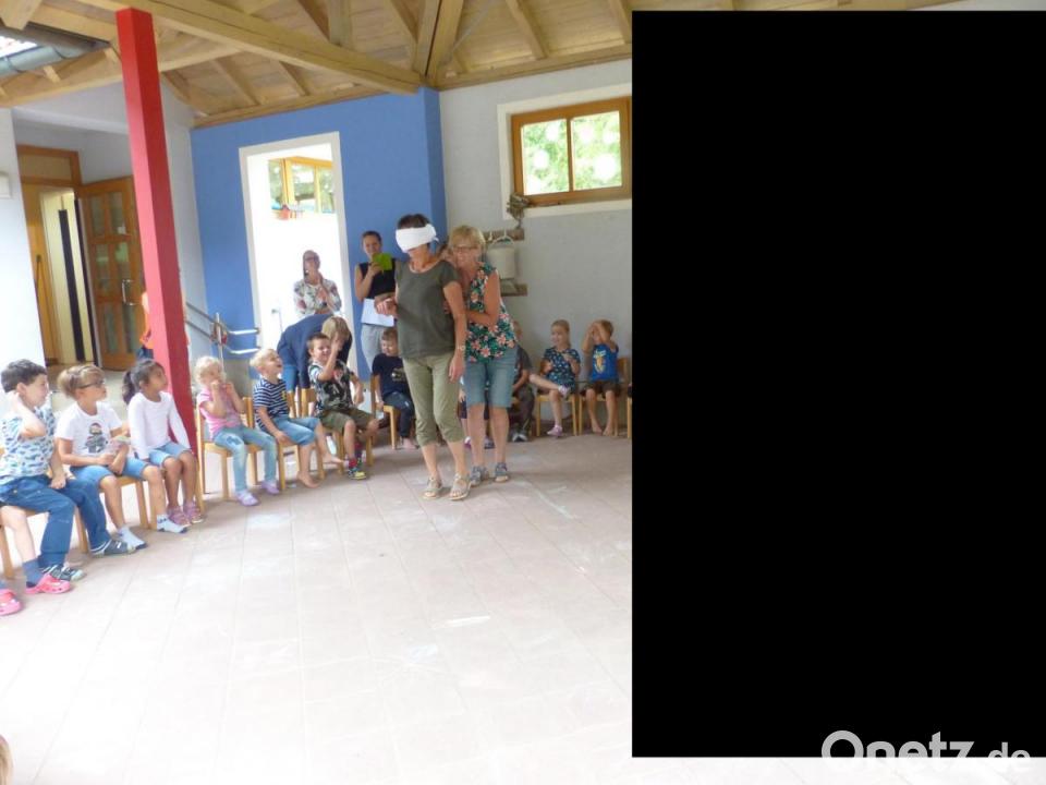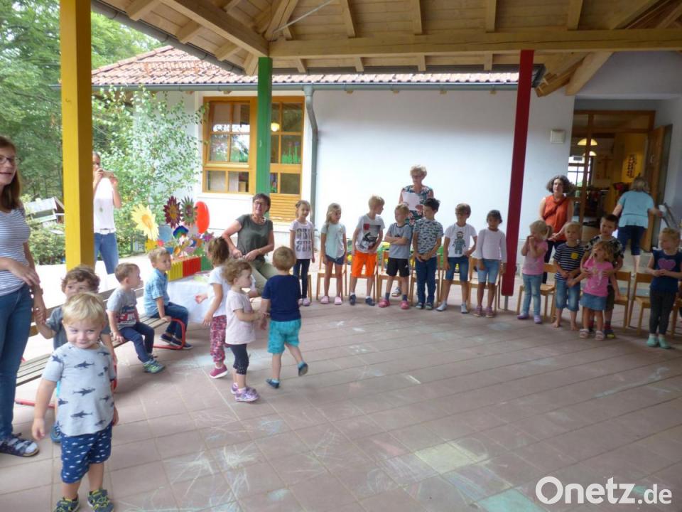 Heimlich haben die Kinder mit ihren Erzieherinnen Monika Meißner, Edeltraud Hampl, Sabine Götz, Magdalena Weiß, Theresa Weih, Katharina Kick, Katrin Kraus, Laura Lang und Anita Wittmann Lieder eingeübt und gebastelt. Aufgeteilt in drei Gruppen waren die Mädchen und Buben und die Rote Gruppe dankte mit Luftballon und einem Kuchenherz, die Gelbe Gruppe mit Weißen Wolken und Regenbogen und die Grüne Gruppe mit Seifenblasen und Kieselstein. Beim Übergeben sangen die Kleinen das Lied „Ich schenk dir einen Regenbogen.“ Franziska, Luisa, Luis M, Lukas, Simon, Luis B, Alois, Amira, Hanna, Finn, Sandro, Emilia, Kristian, Dominik, Laura, Kilian, Janos, Marie und Liana trugen ihren Dank vor. Sie dankten „für Spaß, die Puppenecke, die Baustelle, das Werken, die Geburtstagsfeste, das Trostpflaster, die Lieder, das Schuhebinden, das Jacke wieder finden, die Tage im Wald, das Tränen trocknen, die Musik, den Kletterbaum, die Experimente, die Geduld, fürs offene Ohr und für die schöne, schöne Zeit“ und vieles, vieles mehr.